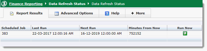 This report shows when the next data refresh is scheduled to run. On most systems, your most up to date data will be loaded into the FAST reporting system on a predetermined schedule, according to your institution's needs. These "data refreshes" are typically run once overnight or every 2, 4 or 8 hours depending on the needs of your institution.
