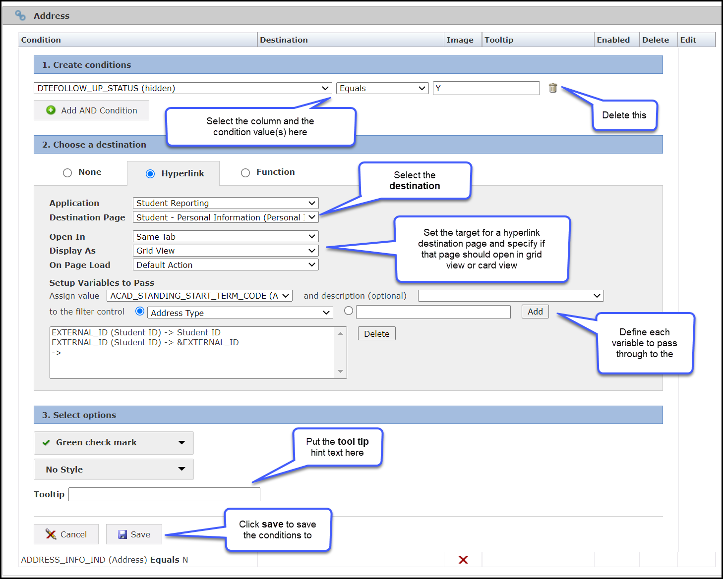 Specify the destination, or what you want to have happen when the condition is met. In this case, you want to specify a hyperlink, and specify the destination, which is the destination reporting page.