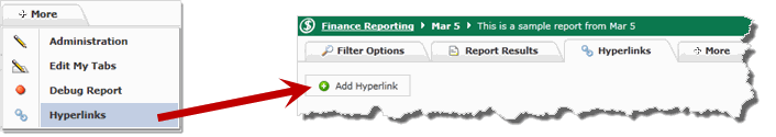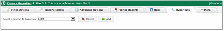 Before you add hyperlinks to your summary reports, you need to first create the more detailed transaction reports that will be the hyperlink target. Once these are created, you can open the custom report in the report viewer and add the hyperlinks to your summary reports using the Hyperlink tab in the +More section of your report view.