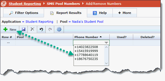 Once you have added one or more numbers to your Pool, be sure to save your changes. This number will now fall off the SMS Number Administration page, indicating that it is no long available to add to a Pool. To add additional numbers to this Pool, simply click the + New button again.