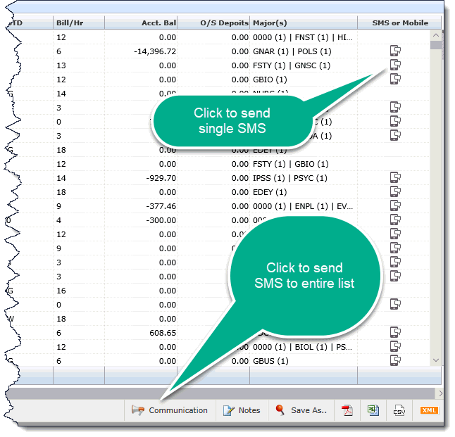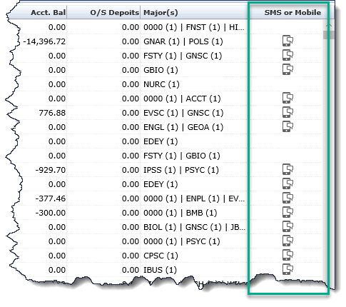 To test your new column and the Communication SMS control, re-execute the report, then locate your column on the report results. This column should now contain the SMS icon for each row where the condition has been met and where a mobile number exists for that student or employee in your ERP. Also note that if the student or employee has opted out of SMS communication, the column will be blank.