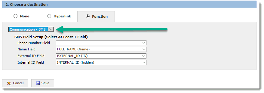Select the Radio Button next to Function and from the drop-down list, select Communication - SMS.