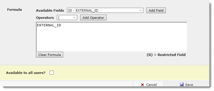 Please Note: Most end users cannot make global or public Virtual Columns; this is reserved as an admin-level function or for specific delegates who have the Virtual Column Admin Role. If you do have this role, it allows you to a) key a formula or text into the formula text box and b) click the Available to all users check box before saving your new column.