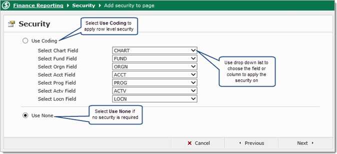 Use Coding (Fund/Orgn): Limits data in the report based on row level security for the user who is executing the report. — from each list, select the field that corresponds to the Chart, Fund and Orgn fields in your query. Note that in Peoplesoft sites, this may use different terminology.