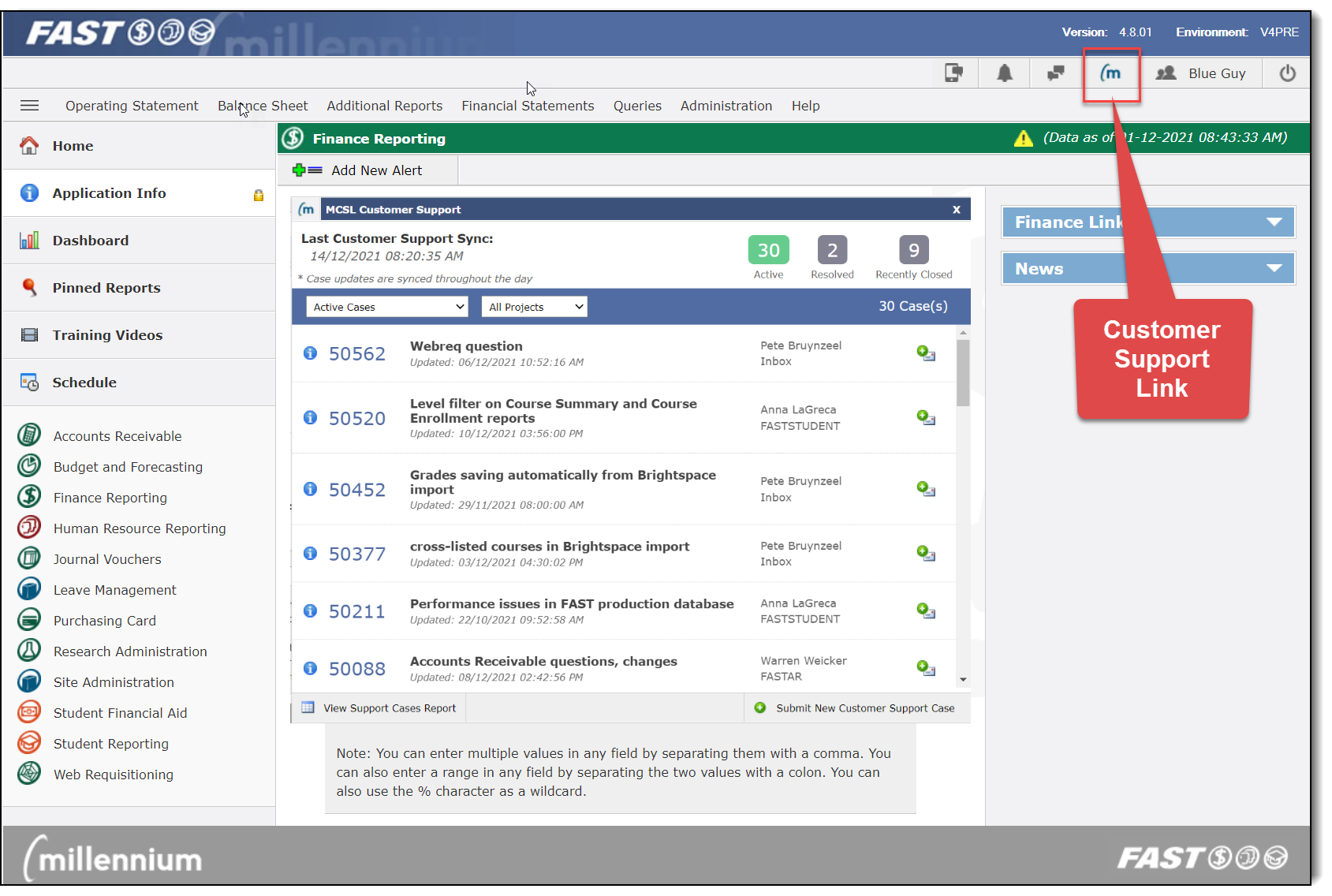 There is a new report called Support Cases located under the Help menu in Site Administration. This report pulls data from the Millennium Customer Support System to show you the status of your submissions to customersupport@mcsl.com. Users with access to this report will also see a button in the top-right corner next to their user profile name which will bring this information up in a pop-up box.