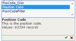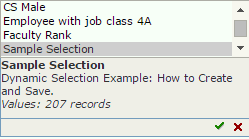 Click the function-based filter button to reveal all current selections available for you to select from. Note: these will display your (private) selections only and cannot be shared with other users. Clicking on any selection will display the description (optional) in the text box as well as a record count for this selection. In other words, if you choose this Dynamic Selection, this displays the count of how many records will be pulled into the query. To choose the current selection, simply click the green check mark or double-click the selection.