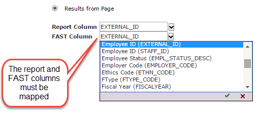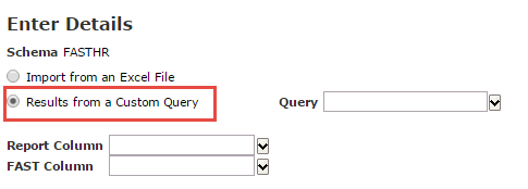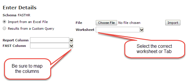 You can Import from an Excel file (browse computer or network drives). You must map the Report Column with a corresponding field/column in FAST (e.g. External ID -> EXTERNAL_ID).