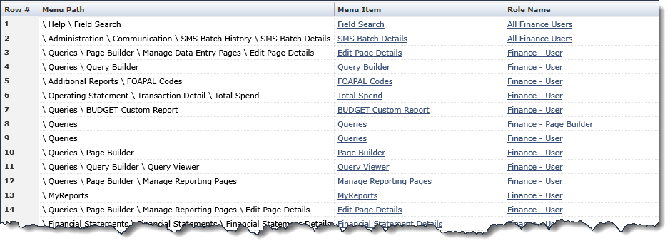 The Report Results page will display a list, by application of the Menu Items associated with each Role Name; in other words for a given Role, what menu items/report options will the user have access to based on their individual roles. The report also includes a Menu Path for cases where more than one report/menu item may have the same name.
