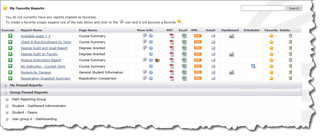 My Favorite Reports: These are the Pinned Reports that you have designated as part of your personal list of "Favorites"; to add reports to this list, locate a Pinned Report in either the Private or Group library and click the Star. To remove reports from this section, you can click the Yellow Favorite star again OR click the Delete button to delete it completely.