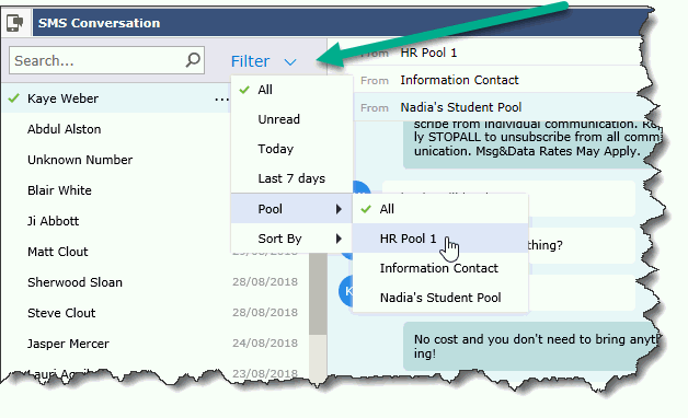 As the list of names and conversations begins to grow, you may also wish to limit or filter your results by such parameters as "Unread" only, or "Last 7 days", or by Pool, etc.