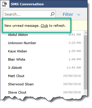 If a student or employee responds to a text message while you're working in the SMS Conversation pop-up, the left-hand pane will display the following message, indicating that a new SMS has been received since last refreshing the conversations: