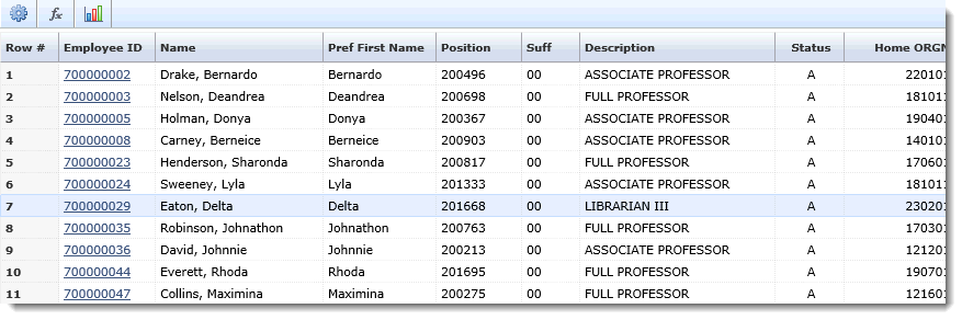Once a report is executed, you will see the report results are displayed in a grid. The first column on the left-hand side of the page displays the Row # and is a numeric field.