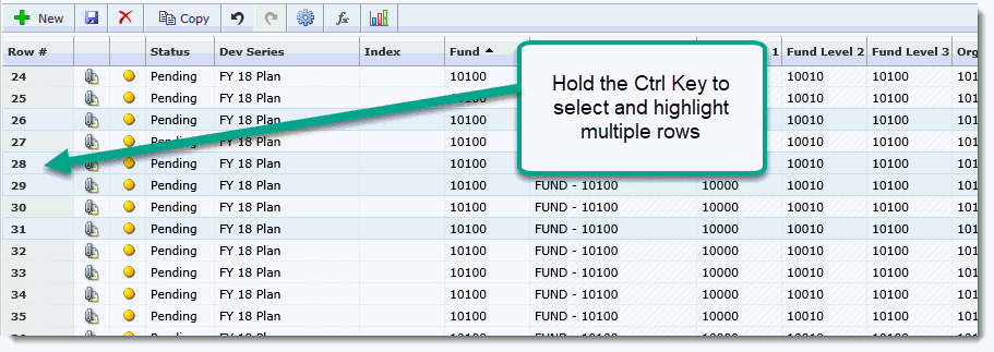 It is often useful to select and isolate rows on your reporting page to review the data clearly, and on larger reports, this is especially helpful to not lose your place on the reporting page as you scroll through the details from left to right. On Data Entry Pages, this function can also serve to delete one or more rows quickly and easily.