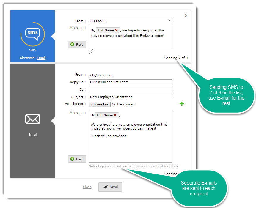 When sending SMS to a group directly from a reporting page, you have the option to also include an "Alternate" communication method for cases where a Mobile Number may not be available but an Email address is.
