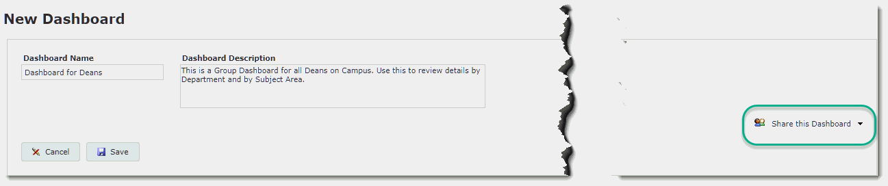 You should include a Name and Description to add context and detail to your new Group Dashboard. Once this step is complete, you're ready to move on to the Sharing Options. To do this, locate and click on the Share this Dashboard Icon: