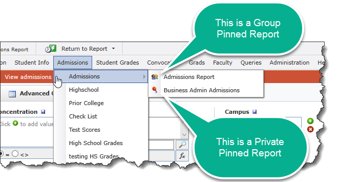 Once you know what reporting page the report has been saved on, it's easy to find the associated Pinned Report(s) to run again. Using this example on the Admissions report, you can see that one is the Group Pinned Report we created (notice the Group icon) and the other is a Private Pinned Report created from the same reporting page in FAST Student Reporting (notice the Pin, indicating a Private report):