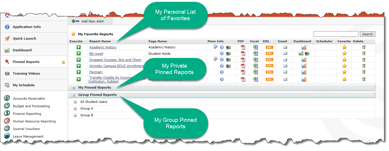 My Favorite Reports: These are the Pinned Reports that you have designated as part of your personal list of "Favorites"; to add reports to this list, locate a Pinned Report in either the Private or Group library and click the Star. To remove reports from this section, you can click the Yellow Favorite star again OR click the Delete button to delete it completely.