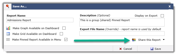 Also keep in mind that your Pinned Reports are the base of all your Scheduled Group reports, graphs, grids and also Dashboards. It's important to understand the security and Sharing Options relating to Pinned Reports before moving on to the more complex layering of Graphing and Sharing Dashboards.