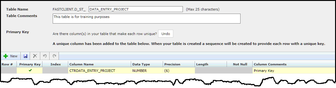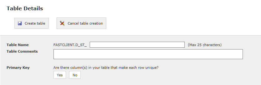 Primary Key: This is a crucial step! If in doubt, please pause here and send an email to Customer Support before proceeding. If your new table will contain a Primary Key (a Column in the table that makes each row unique), then select Yes. If not, select No and FAST will create a Primary Key column for you.