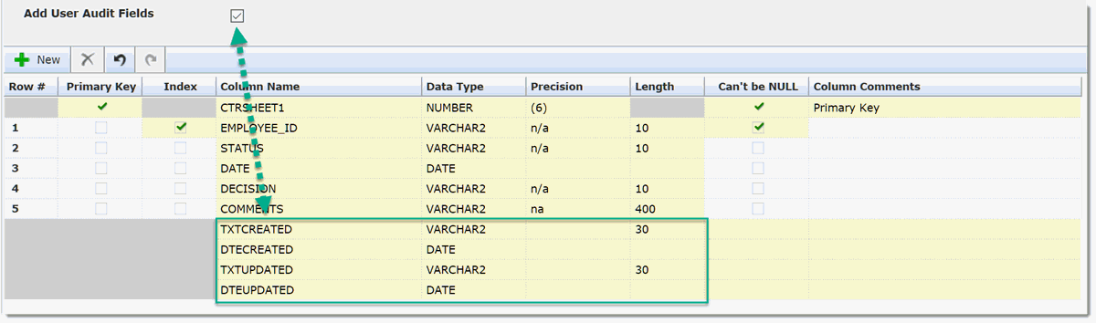 You can also let the FAST Table Builder create these fields for you by selecting the check box labeled Add User Audit Fields on the Table Details Page.