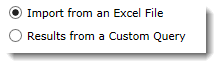 You must then choose to import from an Excel File or from a Custom Query. Select one or the other depending on what dataset you wish to upload back to your ERP. The data can be generated from a FAST Report, an external Excel spreadsheet, or a FAST custom query.