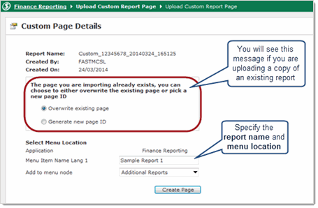 If you are uploading a copy of an existing report, you will get a message that states that the page already exists and you must choose to Overwrite the existing page or generate a new page ID.
