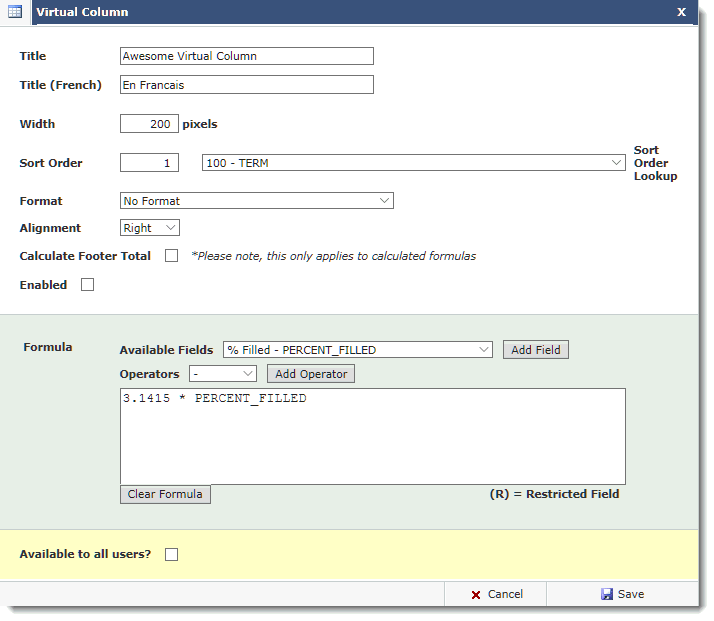 Available to all users? - Yes or No; this option will only display if you are an Administrator in this application; this will make the column visible globally and for all end users. It is strongly recommended that you only enable the Virtual Column for all end users once you have enabled it first for yourself and tested it sufficiently.