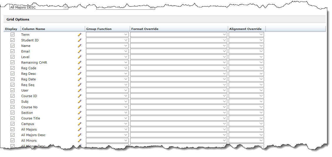 Grid Options: There are several ways you can modify and refine the data that is being returned on your report. These options include: Display, Column Name override, Group Functions, Format override and Alignment override. Every report has certain "default" settings; this is your chance to override those defaults for your own personal reporting requirements.