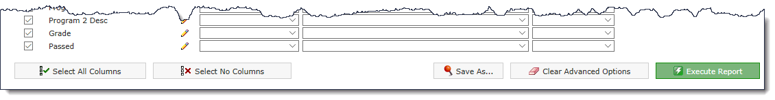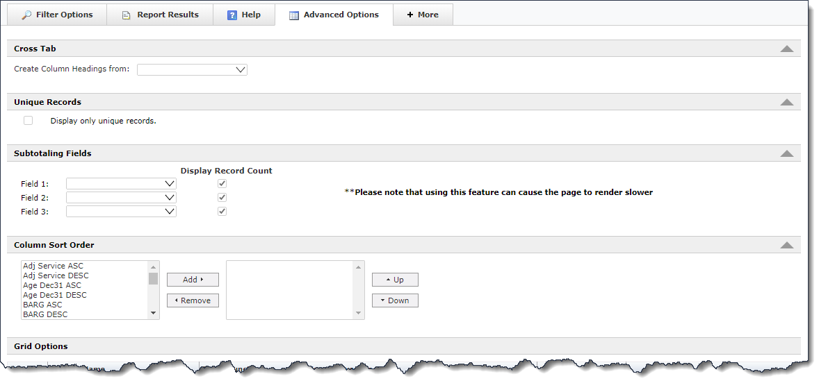 Under Grid Options, you can also use the Select All or Select No Columns buttons as well as Clear Advanced Options. Always remember to re-execute your report when any formatting changes have been made in order to apply those changes.