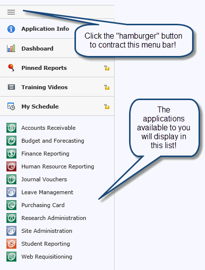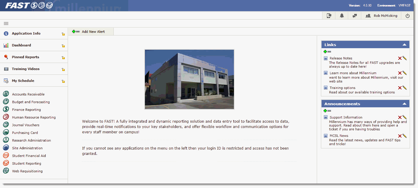 Applications:The FAST applications are listed on the left side of the page. The FAST applications you have access to are limited by your user roles and are set up by the system administrator. For example, if you are a Faculty member, you will have the Student application; if you are in the Accounting department, you might have the Finance and Budget applications available to select from.