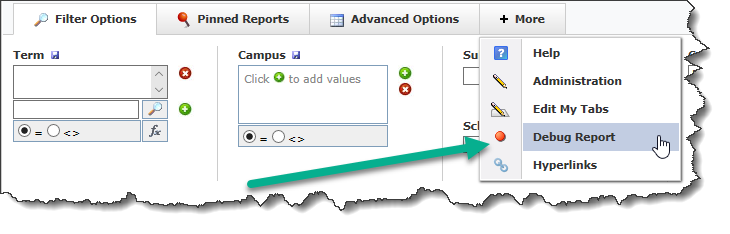 If the Debug Report tab is not open, click the + More tab and then Debug Report.