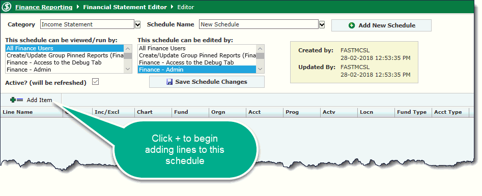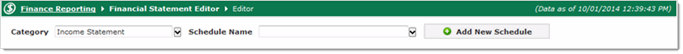 In the Financial Statement Editor, you add accounting lines and include or exclude specific codes to create the financial statement you want. You can also add a range of codes for your schedule, and after you are finished, you can build and view the schedule.