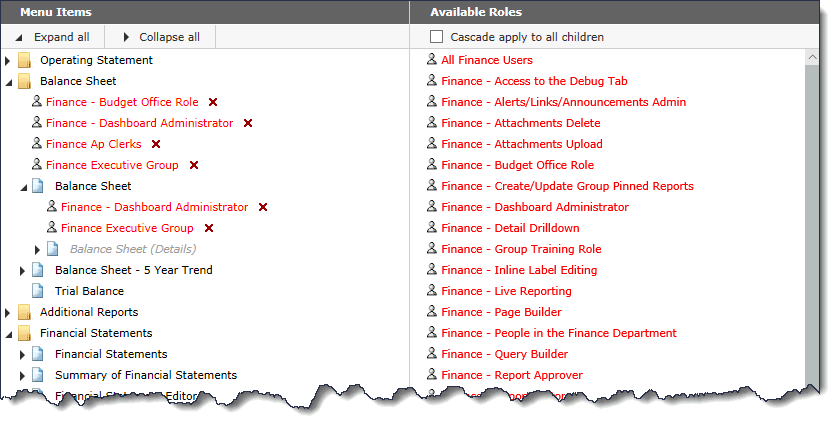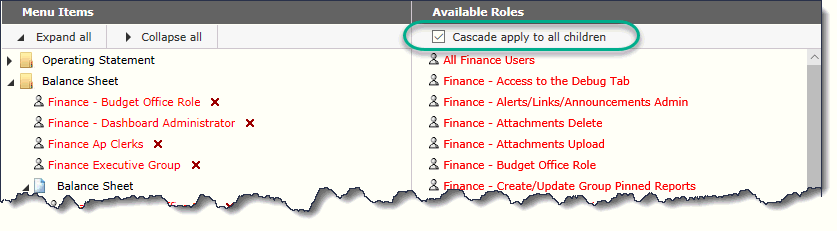 To quickly apply access to an entire menu (all nodes), click the Cascade option before dragging and dropping the role to the Menu Item. This will cause the role to automatically be assigned to all children on the menu without the need to drag and drop each one. The Cascade check box will stay enabled until you choose to de-select it.