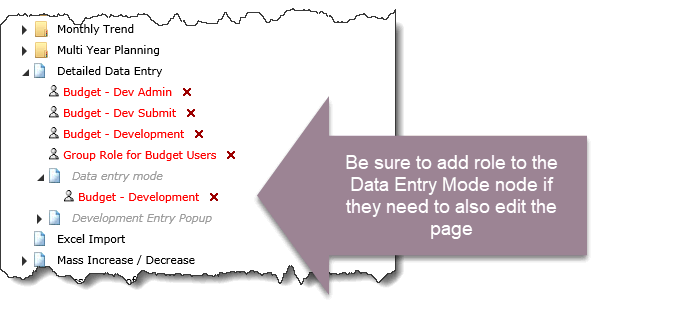 The settings are also designed to specify distinct levels of security: read-only or read/write. When assigning a security role to a menu item on the page, if that menu item (page) is a data entry grid style page, you will see a gray/italic child node called "Data Entry Mode" immediately below it.