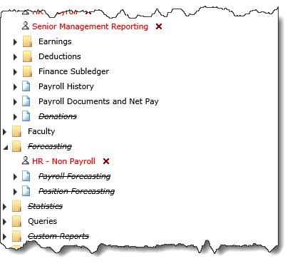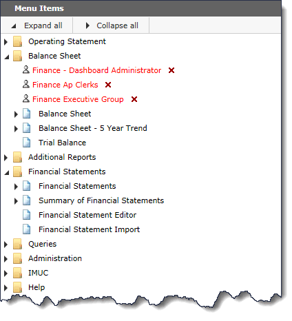 Expand a menu to view the roles that have previously been assigned to it. If a menu option cannot be expanded, no roles have been assigned yet (no + sign = no users can see it!)