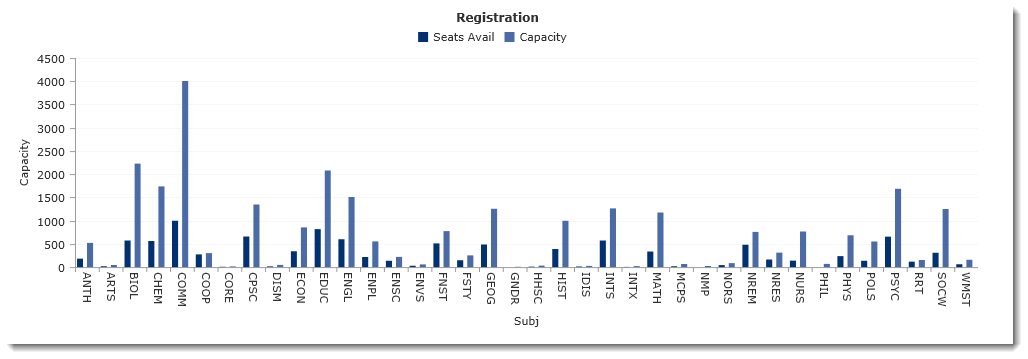 In this sample, I used Subject Code as my X-Axis and a Count of Total Capacity and Count of Available Seats as my side-by-side Y-Values (to compare Capacity to Seats Available).