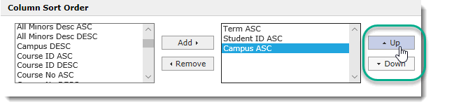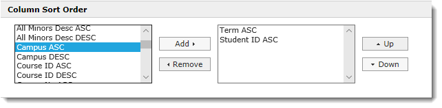 From the Column Sort Order list, select one or more columns to sort by, in either ascending (ASC) or descending (DESC) order. Click Add or Remove to add or remove them from the applied sort order: