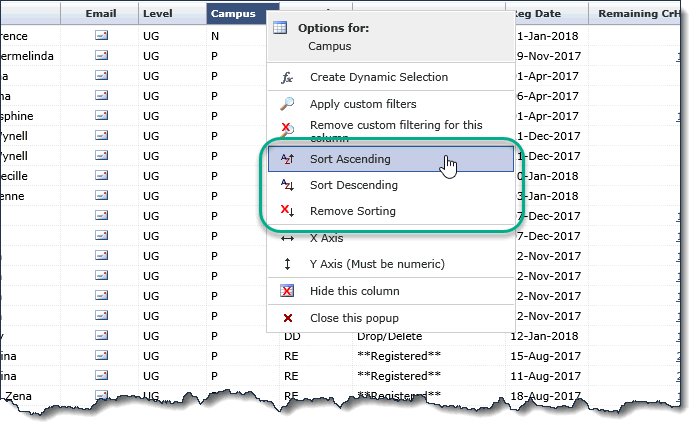 You can define the column sort options using one of two options: directly on the reporting page and/or in the Advanced Options Tab.