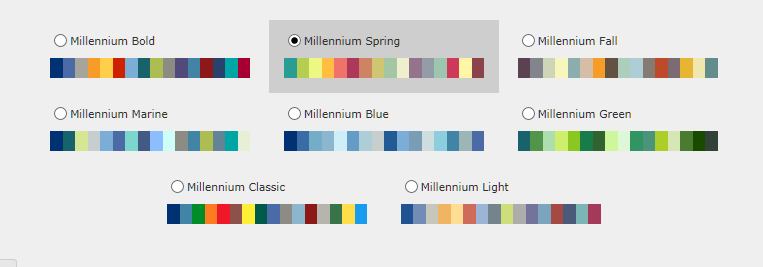 A list of pre-defined options will display for you to choose from! These options are configured by the Administrators and may be customized at the Admin level. Once you choose a Theme (or Color Palette), it will be applied to the contents of the entire Dashboard, not to a single Graph: