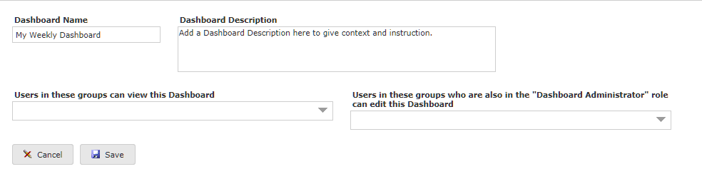 An important note for those of you managing Group Dashboards: Managing Group Dashboards is exactly the same as managing Private Dashboards with one key exception - only certain users will be able to view those Dashboards and the contents on them. To better understand Sharing Options, please review the section called Sharing Dashboards.