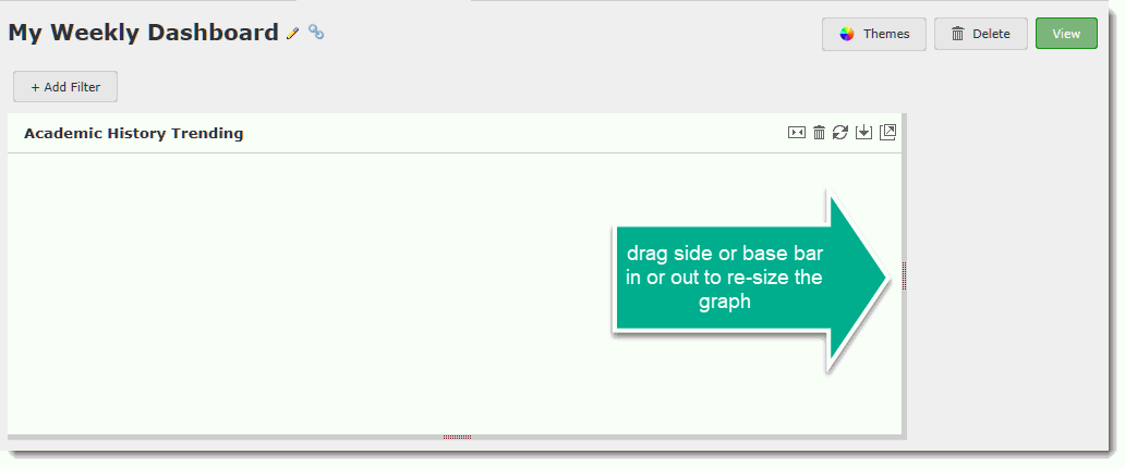 To re-arrange or re-configure your Dashboard, simply use standard drag & drop functionality. You can move graphs around on the Dashboard or you can re-size any graph by simply dragging the side or base bar in or out.