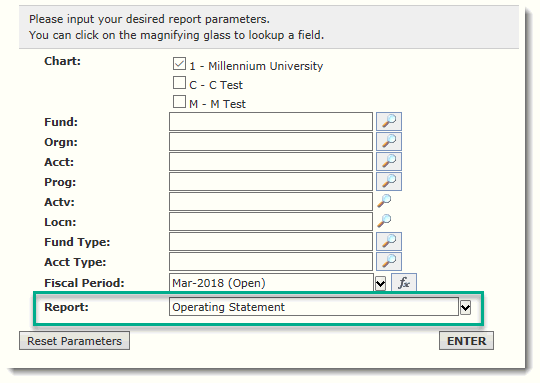 Apply any additional parameters (such as a Fund Code, Account number or range, etc.), Select a Fiscal Period and click ENTER to run the Operating Statement.