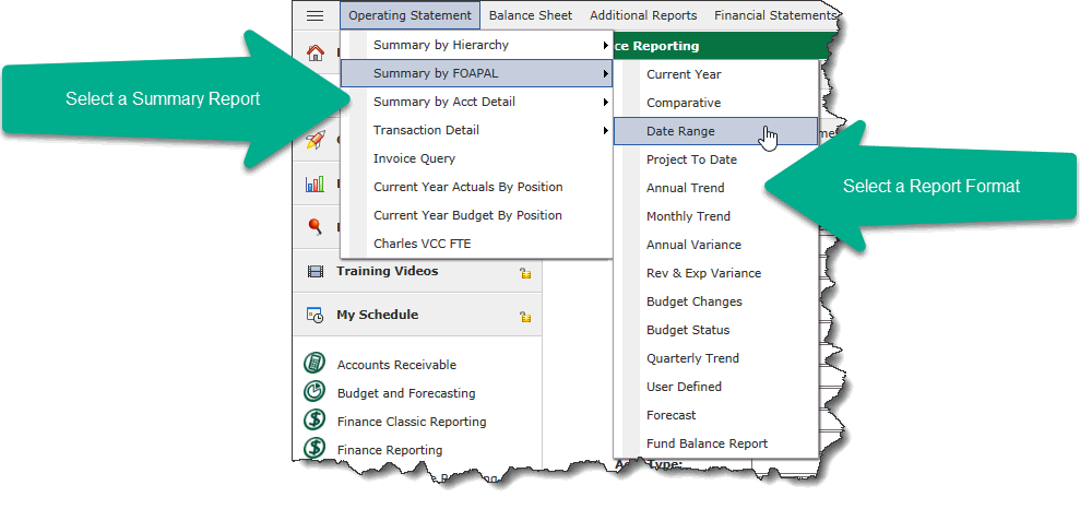 Note: Users with the security role "Finance - Live Reporting" will be able to select a Report Source when executing an Operating Statement report and select to run summary against live ERP data instead of data warehouse tables.