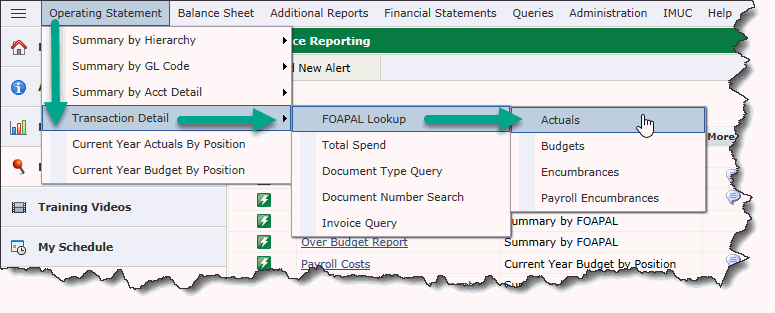Transaction Detail reports allow you to view the details of individual transactions and to drill down to the supporting journal vouchers, invoices and other supporting documentation. Different formats of the Transaction Details can be opened from the FAST Finance menu. They can also be viewed by drilling down from the Operating Statement summaries or the Balance Sheet. After you open the Transaction Detail, you can drill down further to the Document Details.