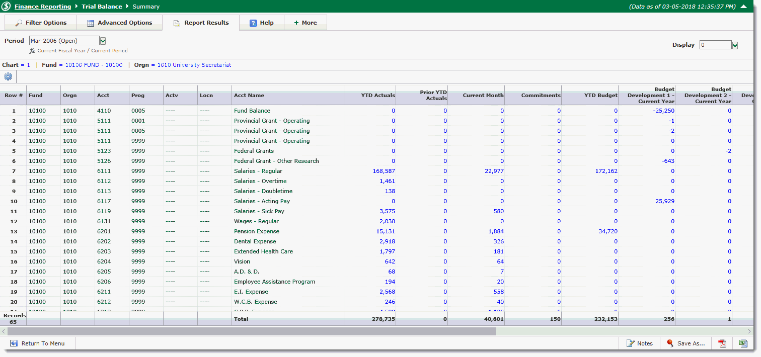 You can open the Trial Balance with a high-level view by executing the report with no additional filters selected, or enter accounting codes to display more specific information that you might need. You must have the Fiscal Period and a Chart selected in order to run the Trial Balance Report.