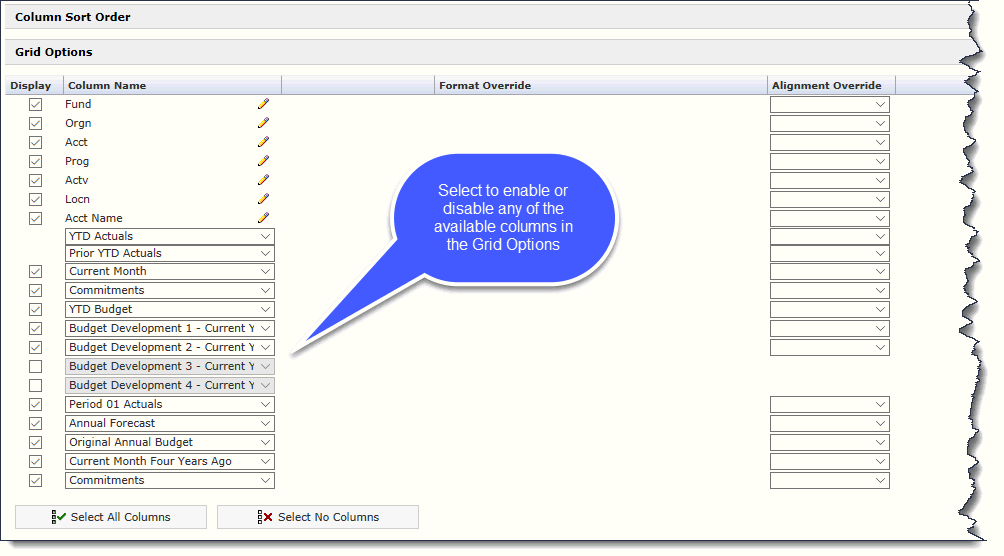 The columns that can be changed have drop-down lists beside them. Select a different column from the list to change the data element being returned in that column.