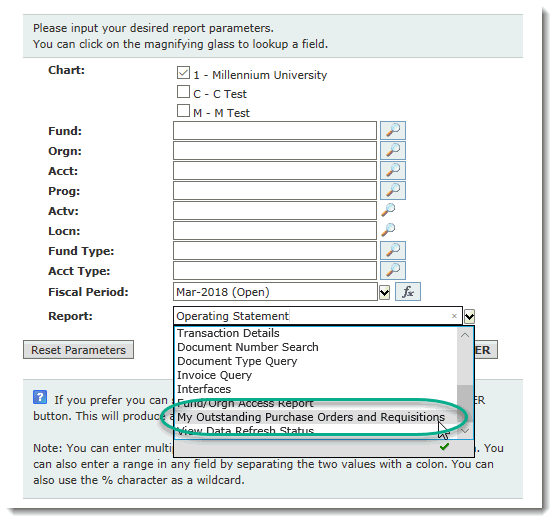 The Outstanding Purchase Orders and Requisitions report, which is also referred to as the Transaction Detail Coding Lookup (Encumbrances) page, lists all purchase orders and requisitions for a given fiscal period.
