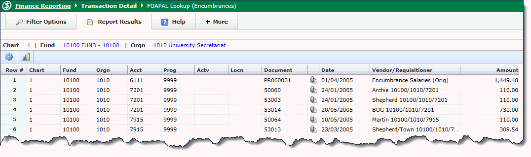 Select from the available Filter Options and click Execute Report. The Transaction Detail Coding Lookup (Encumbrances) page opens (shown above).