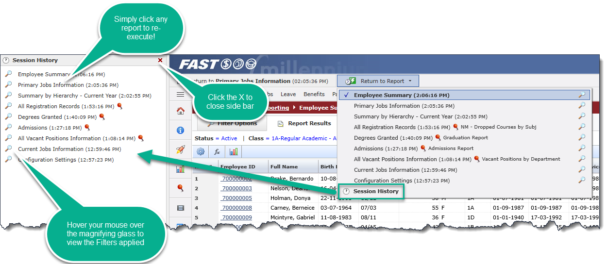 FAST automatically maintains a history of the reports that you have executed within a session.