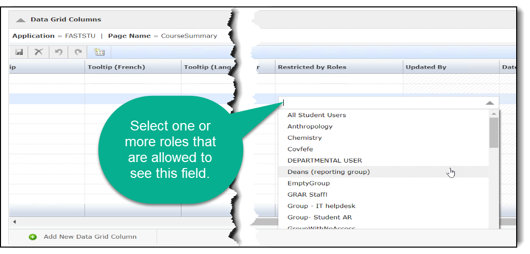 From the list, select the role(s) you are using to restrict this field/column. You can select multiple roles by using ctrl + click.